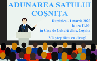 Primăria comunei Coşniţa invită toţi doritorii de a participa la Adunarea satului Coşniţa care va avea loc la data de 1 martie 2020 […]